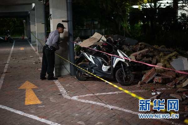 8月5日,在印度尼西亞西努沙登加拉省龍目島以西的巴厘島,一名安保人員查看一處停車(chē)場(chǎng)里的落石。 新華社發(fā)(穆罕默德·福齊·哈尼亞戈攝)
