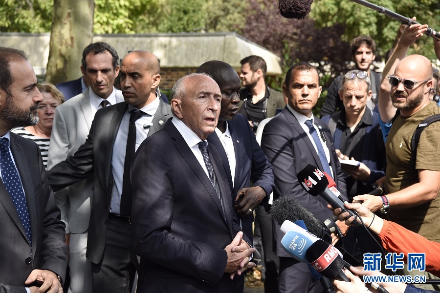 8月23日,在法國巴黎西南郊特拉普市,法國內(nèi)政部長科隆(中)向媒體介紹情況。 新華社記者陳益宸攝