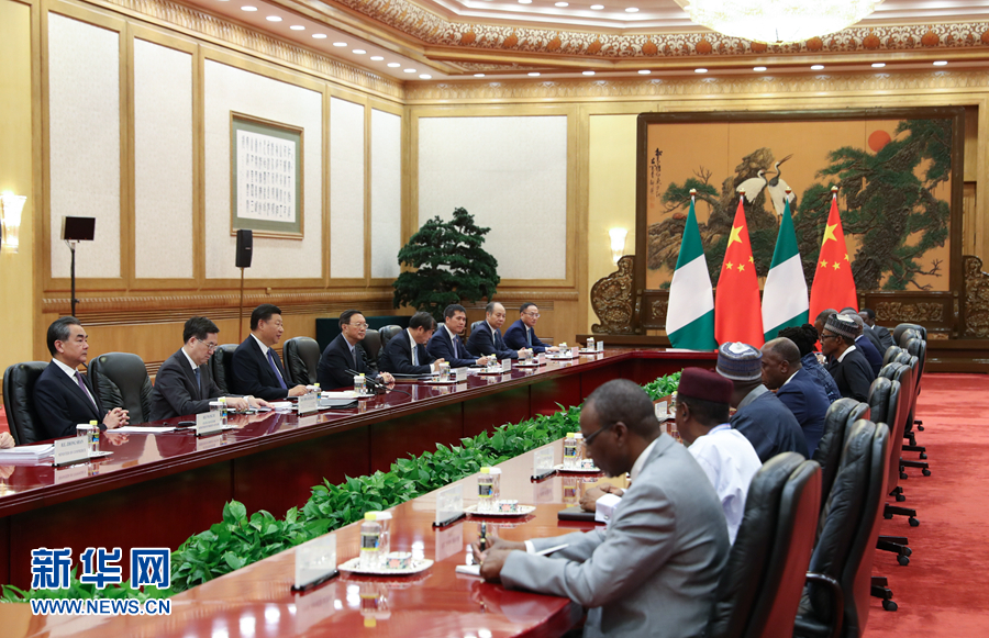 習近平強調,在中非雙方共同努力下,中非合作論壇北京峰會成功閉幕,中非全面戰略合作伙伴關系的內涵進一步充實豐富,成為中非團結合作的一次歷史性盛會。尼日利亞是非洲大國,也是中國在非洲重要的合作伙伴,我高度重視中尼關系發展。兩國關系正處于歷史上最好時期。中方贊賞尼日利亞政府堅持一個中國政策,愿繼續同尼方在涉及彼此核心利益和重大關切問題上相互理解和支持。中方歡迎尼方參與“一帶一路”建設,愿同尼方深化基礎設施建設、農業、產能等領域合作,密切人文交流,助力尼日利亞經濟社會發展,將中尼合作打造成中非合作的典范。