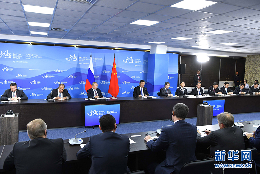 9月11日,國家主席習近平在符拉迪沃斯托克和俄羅斯總統普京共同出席中俄地方領導人對話會。 新華社記者 饒愛民 攝