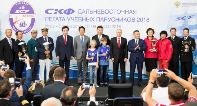9月12日,第四屆東方經(jīng)濟(jì)論壇全會在符拉迪沃斯托克舉行。中國國家主席習(xí)近平、俄羅斯總統(tǒng)普京、蒙古國總統(tǒng)巴特圖勒嘎、日本首相安倍晉三、韓國總理李洛淵等出席。這是全會后,與會各國領(lǐng)導(dǎo)人共同出席第三屆“遠(yuǎn)東杯”國際帆船拉力賽第一賽段頒獎儀式。新華社記者 黃敬文 攝