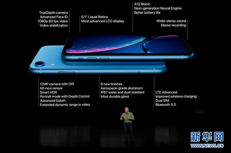 9月12日,在美國加利福尼亞州丘珀蒂諾市舉行的蘋果新品發布會上,蘋果公司全球市場營銷高級副總裁菲利普·席勒介紹新推出的蘋果手機iPhone XR。新華社發
