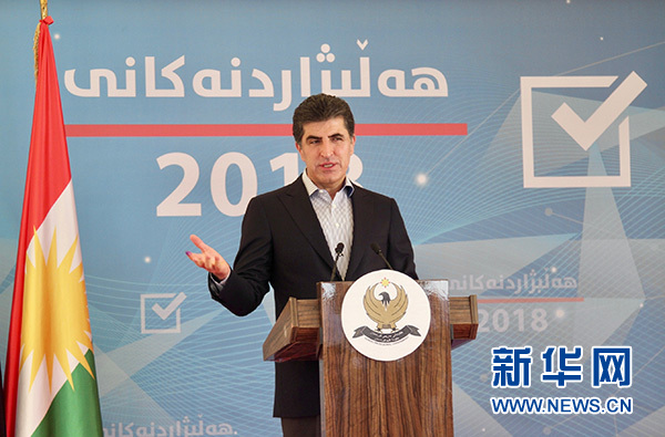 9月30日,伊拉克庫爾德自治區(庫區)政府總理內奇爾萬·巴爾扎尼在埃爾比勒市投票后出席新聞發布會。 新華社發(亞瑟爾·賈瓦德 攝)