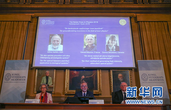 10月2日,瑞典皇家科學(xué)院在斯德哥爾摩舉行新聞發(fā)布會(huì),公布2018年諾貝爾物理學(xué)獎(jiǎng)獲得者。新華社記者 葉平凡 攝