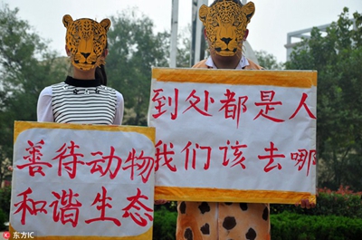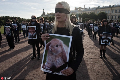 手持動(dòng)物畫像,宣傳“動(dòng)物不是衣服”