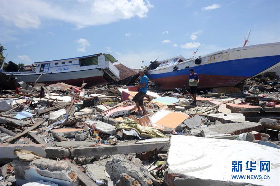 10月5日,在印度尼西亞中蘇拉威西省棟加拉縣,災民在房屋廢墟中尋找可用物品。 新華社發(阿貢攝)