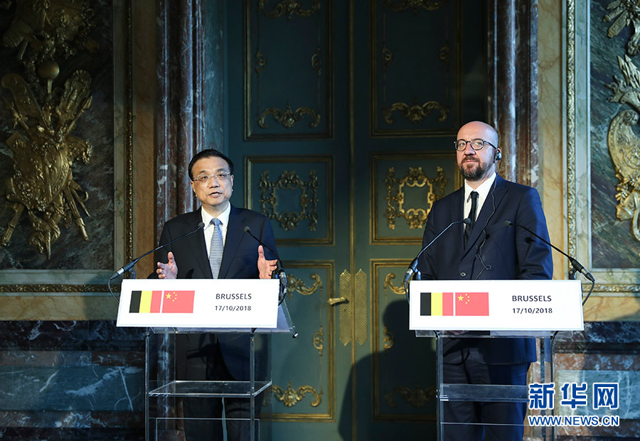 當(dāng)?shù)貢r(shí)間10月17日上午,國務(wù)院總理李克強(qiáng)在布魯塞爾埃格蒙宮與比利時(shí)首相米歇爾共同會(huì)見記者。 新華社記者 丁海濤 攝