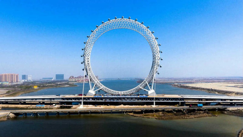 “渤海之眼”摩天輪由一個外層外形支承桁架組成。這個環形架由4600噸鋼梁建成,花兩年時間建造。有別于傳統的有軸摩天輪,渤海之眼摩天輪中間沒有任何支撐,運行時輪盤不轉動,轎廂自帶行走機構,通過軌道沿輪盤轉動。