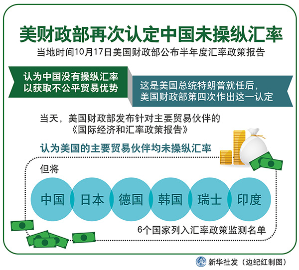 新華社華盛頓10月17日電(記者楊承霖 高攀)美國財政部17日公布半年度匯率政策報告,認為中國沒有操縱匯率以獲取不公平貿易優(yōu)勢。這是美國總統(tǒng)特朗普就任后,美國財政部第四次作出這一認定。