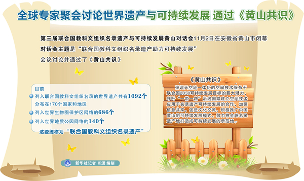 全球?qū)<揖蹠?huì)討論世界遺產(chǎn)與可持續(xù)發(fā)展 通過《黃山共識(shí)》 新華社記者 肖瀟 編制