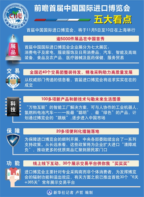 圖表:前瞻首屆中國(guó)國(guó)際進(jìn)口博覽會(huì)五大看點(diǎn) 新華社記者 盧哲 編制