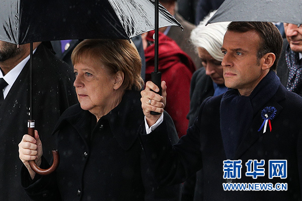 11月11日,法國總統馬克龍(右)與德國總理默克爾從法國巴黎的香榭麗舍大街走向凱旋門,參加一戰結束百年紀念儀式。新華社記者 鄭煥松 攝