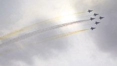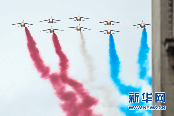 11月11日,法國空軍“法蘭西巡邏兵”飛行表演隊在一戰結束百年紀念儀式上飛過巴黎凱旋門。 新華社記者 鄭煥松 攝