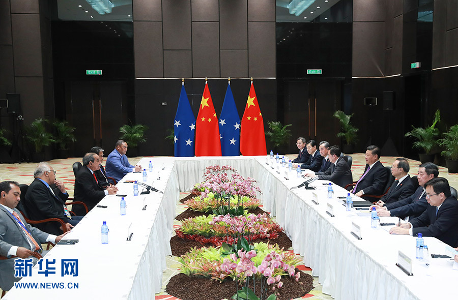11月16日,國(guó)家主席習(xí)近平在莫爾茲比港分別會(huì)見(jiàn)建交太平洋島國(guó)領(lǐng)導(dǎo)人。這是習(xí)近平會(huì)見(jiàn)紐埃總理塔拉吉。 新華社記者 丁林 攝