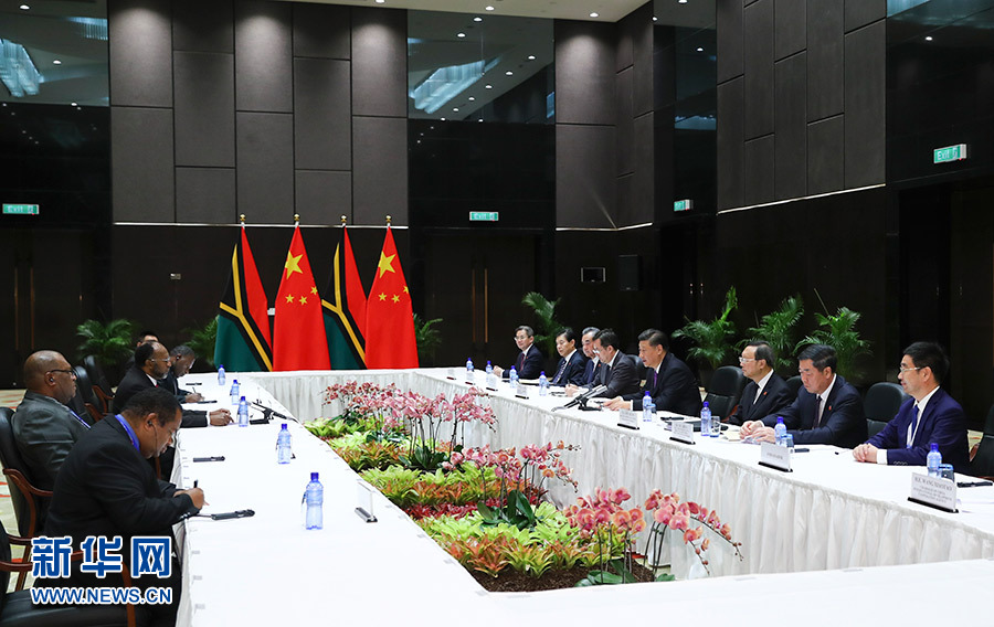 11月16日,國(guó)家主席習(xí)近平在莫爾茲比港分別會(huì)見(jiàn)建交太平洋島國(guó)領(lǐng)導(dǎo)人。這是習(xí)近平會(huì)見(jiàn)瓦努阿圖總理薩爾瓦伊。 新華社記者 謝環(huán)馳 攝