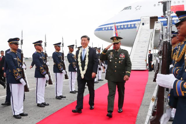 11月20日,國家主席習近平抵達馬尼拉,開始對菲律賓共和國進行國事訪問。這是習近平在機場受到菲律賓政府高級官員熱情迎接。新華社記者黃敬文攝