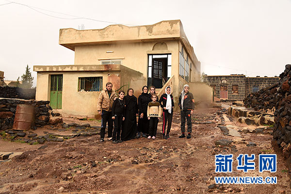 在敘利亞南部蘇韋達省舍比克村,阿布·阿馬爾一家站在自家房前合影(11月14日攝)。新華社發(胡馬姆 攝)