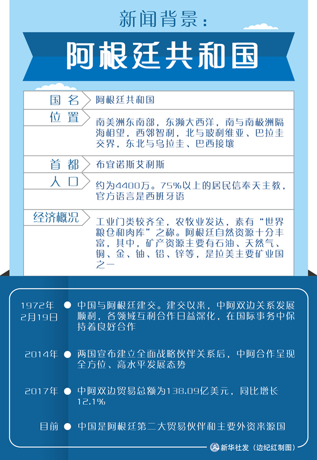 1972年2月19日,中國與阿根廷建交。建交以來,中阿雙邊關系發展順利,各領域互利合作日益深化,在國際事務中保持著良好合作。2014年兩國宣布建立全面戰略伙伴關系后,中阿合作呈現全方位、高水平發展態勢。目前,中國是阿根廷第二大貿易伙伴和主要外資來源國。2017年中阿雙邊貿易總額為138.09億美元,同比增長12.1%。