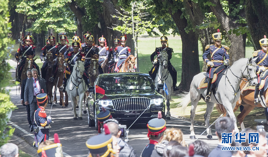 習近平和夫人彭麗媛在馬隊護衛下前往總統官邸,禮兵在林蔭大道兩側列隊接受檢閱。抵達榮譽廣場時,軍樂團奏響歡快的進行曲。馬克里和夫人阿瓦達上前熱情迎接。兩國元首夫婦登上檢閱臺。軍樂團奏中國、阿根廷兩國國歌。