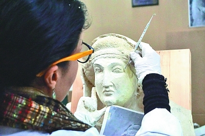 12月5日,在敘利亞首都大馬士革,文物修復(fù)師赫芭·朱馬在國(guó)家博物館內(nèi)修復(fù)來(lái)自巴爾米拉的受損雕像。新華社發(fā)