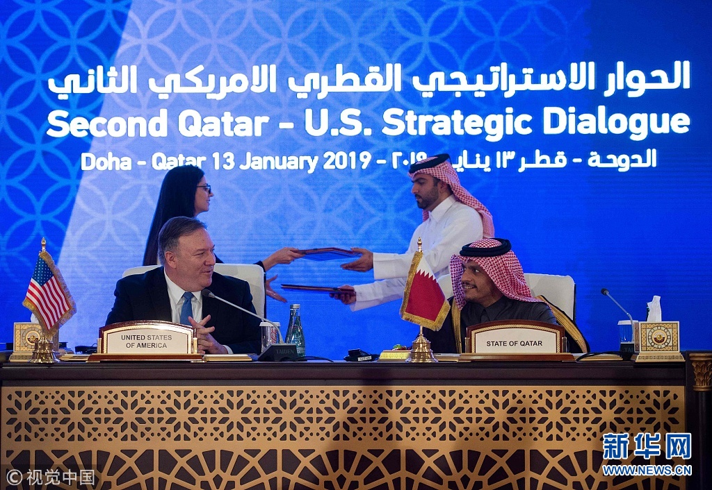2019年1月13日,卡塔爾多哈,美國國務卿邁克·蓬佩奧訪問卡塔爾。蓬佩奧與卡塔爾副首相兼外交大臣穆罕默德在多哈的喜來登大酒店簽署了諒解備忘錄和意向聲明并舉行聯合記者會。蓬佩奧表示,兩國外交部門領導人當天簽署了一份諒解備忘錄,將擴建和改造烏代德美國空軍基地。(圖片來源:視覺中國)