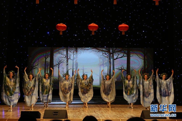 1月23日,在白俄羅斯首都明斯克,白俄羅斯國家模范功勛舞蹈團的藝術家們在“歡樂春節”歌舞晚會上表演。新華社記者 魏忠杰 攝
