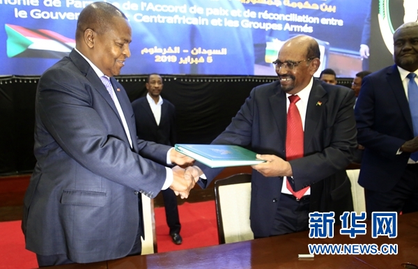 新華社喀土穆2月5日電(記者馬意翀)中非共和國沖突多方代表5日在蘇丹首都喀土穆簽署和平協議。蘇丹總統巴希爾和中非共和國總統圖瓦德拉共同出席了簽署儀式。