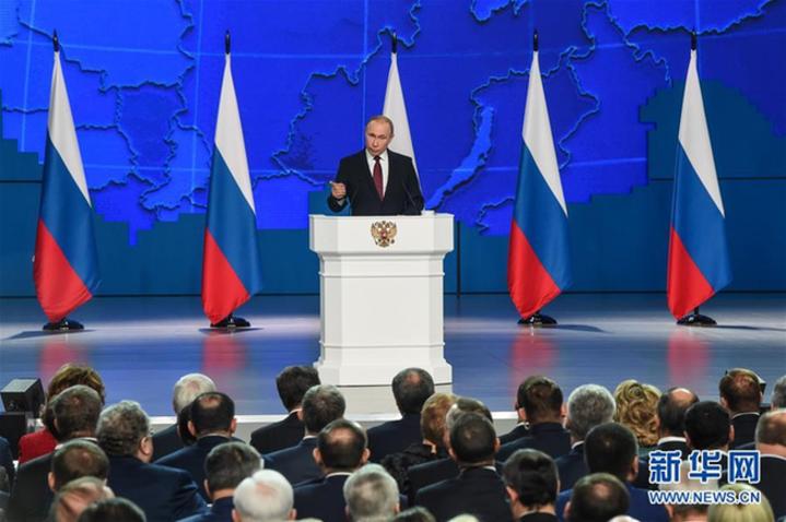 2月20日,在俄羅斯首都莫斯科,俄總統普京向議會上下兩院發表國情咨文。 新華社發(葉甫蓋尼·西尼岑攝)