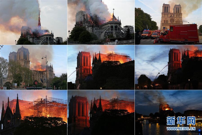 這張拼版照片顯示的是4月15日,在法國巴黎,巴黎圣母院燃起大火。當?shù)貢r間15日傍晚,位于巴黎市中心、有著800多年歷史的巴黎圣母院發(fā)生大火,熊熊烈火之中,巴黎圣母院塔尖轟然倒塌,整座建筑損毀嚴重。新華社發(fā)