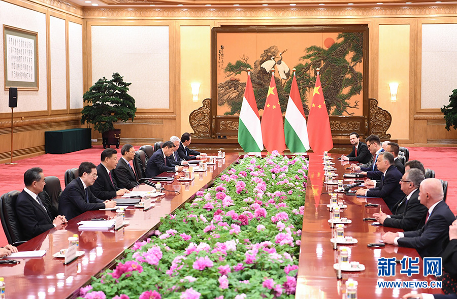 習近平指出,2017年,我和總理先生共同宣布兩國建立全面戰略伙伴關系,中匈關系進入“換擋提速”的歷史新階段。今年是中匈建交70周年。中方期待同匈方一道努力,推動兩國全面戰略伙伴關系邁向新高度。雙方要保持高層交往熱度,做好政治引領;提升互尊互信水平,深化戰略認同;加大務實合作力度,實現互利共贏;拓寬人文交流廣度,促進民心相通。下階段,我們要落實好匈塞鐵路等“一帶一路”框架內合作,爭取更多實質成果。中國-中東歐合作是中歐關系重要組成部分,希望匈方為此發揮更大作用。