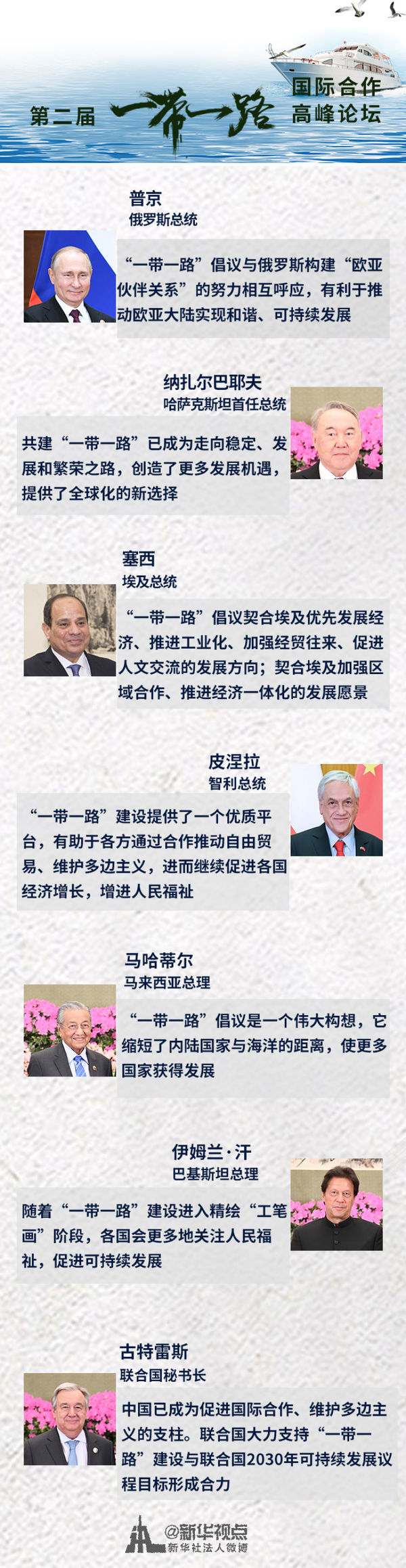 “我們要秉持共商共建共享原則,倡導多邊主義,大家的事大家商量著辦”“我們要堅持開放、綠色、廉潔理念,不搞封閉排他的小圈子”“我們要努力實現高標準、惠民生、可持續目標,引入各方普遍支持的規則標準”……本屆高峰論壇,習主席再次為共建“一帶一路”指明了方向。