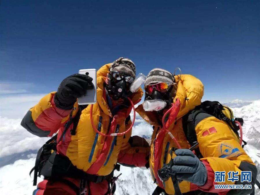 珠穆朗瑪峰頂,王銀龍向關嫻求婚(2018年5月16日攝)。新華社發