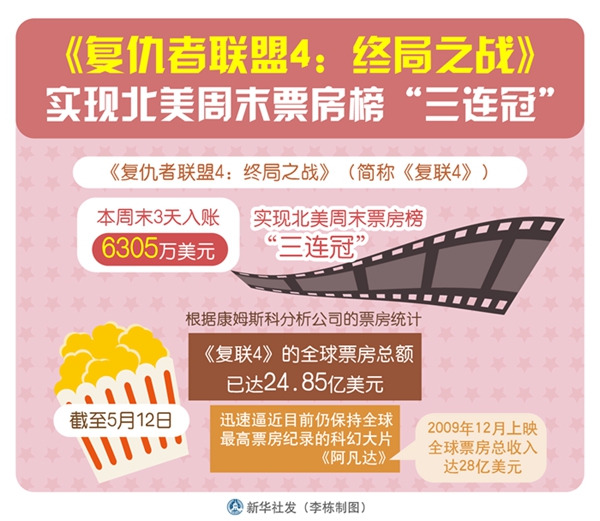 新華社洛杉磯5月12日電(記者高山)盡管面臨強勁挑戰(zhàn),《復仇者聯(lián)盟4:終局之戰(zhàn)》(簡稱《復聯(lián)4》)本周末依然憑借3天入賬6305萬美元,實現(xiàn)北美周末票房榜“三連冠”。