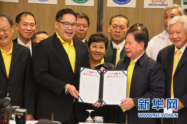 5月13日,在泰國(guó)曼谷,泰國(guó)力量黨黨首三攀(中右)作為11黨代表向人民國(guó)家力量黨黨首烏達(dá)瑪(中左)提交支持意向書(shū)。 新華社記者 楊舟 攝