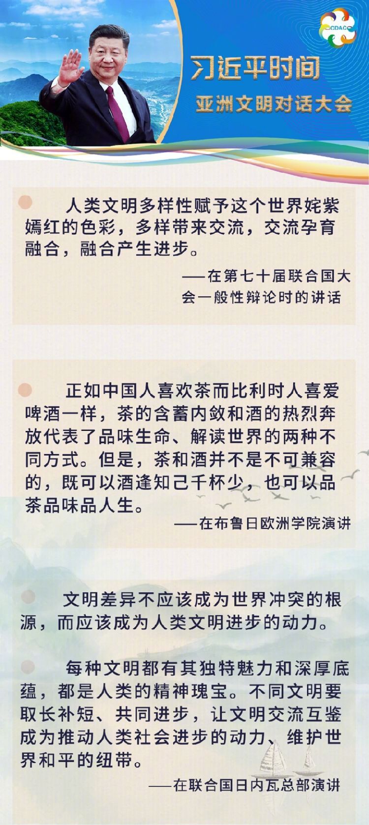 “在漫長歷史長河中,如亞洲的黃河和長江流域、印度河和恒河流域、幼發拉底河和底格里斯河流域以及東南亞等地區孕育了眾多古老文明,彼此交相輝映、相得益彰,為人類文明進步作出了重要貢獻。今天的亞洲,多樣性的特點仍十分突出,不同文明、不同民族、不同宗教匯聚交融,共同組成多彩多姿的亞洲大家庭。”
