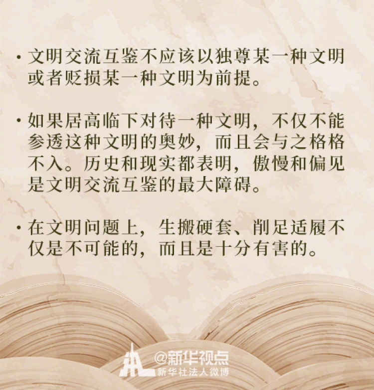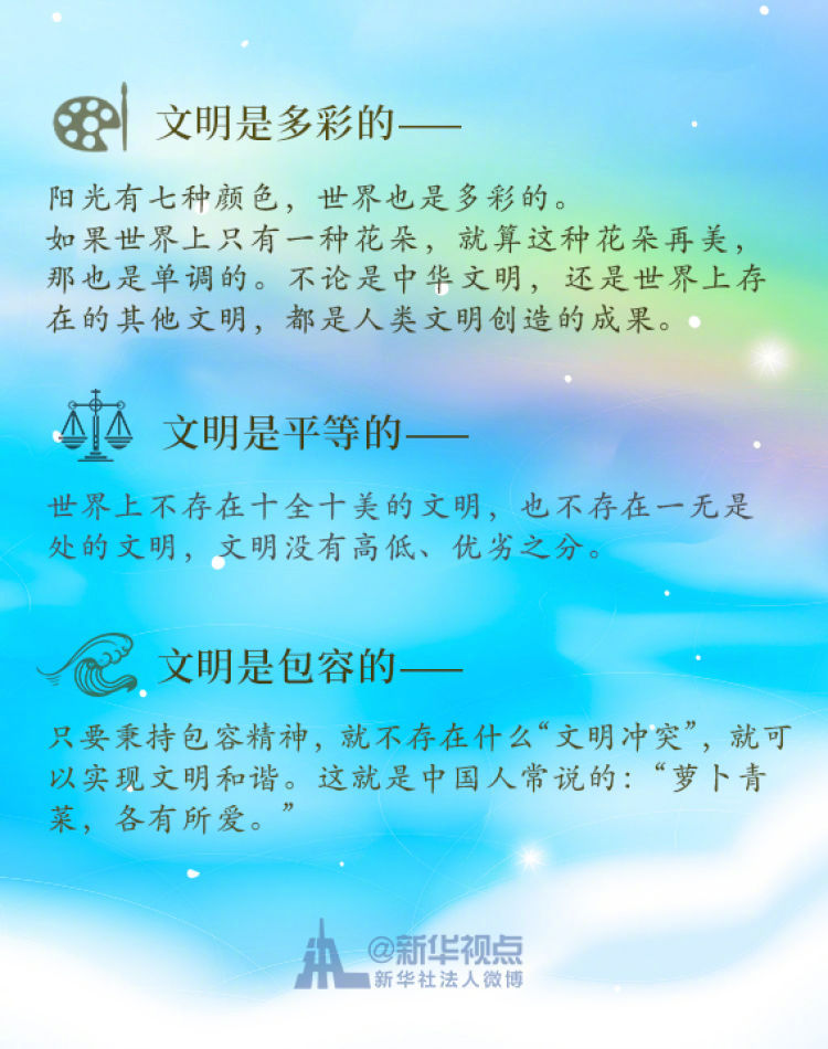 在這次演講中,習近平主席用生動的語言講明了對待不同文明應有的態度和原則: