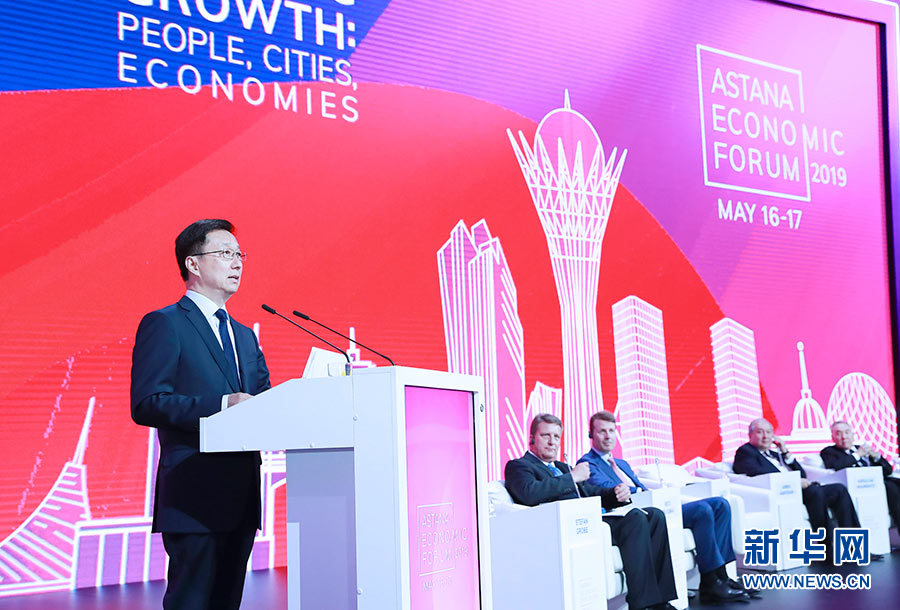 韓正在第十二屆阿斯塔納經濟論壇上發表題為《共享機遇 共謀發展 共贏未來》的致辭表示,中國擁有世界上最雄厚的人力資源,在統籌城鄉發展、推進新型城鎮化方面取得顯著進展,經濟發展前景廣闊,將始終是世界經濟增長的穩定動力源和各國拓展商機的活力大市場。韓正提出四點建議:一是加強開放合作,共同支持經濟全球化和貿易投資自由化便利化,推動世界經濟穩定增長。二是加強可持續發展合作,攜手應對氣候變化、海洋污染、生物保護等全球性環境問題,共同呵護地球家園和促進人類共享發展成果。三是加強城鎮化合作,促進城市可持續發展,共同提升城市在現代化建設中的引擎作用。四是加強創新和人才合作,激發人的創造力,挖掘人力資源潛力,共同培育經濟高質量發展的新動能。