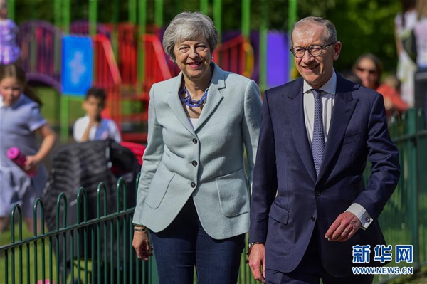 5月23日,在英國桑寧,英國首相特雷莎·梅(左)抵達投票站。新華社發(史蒂芬·程 攝)
