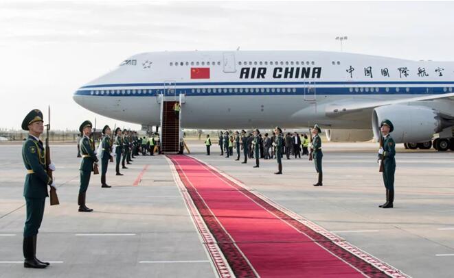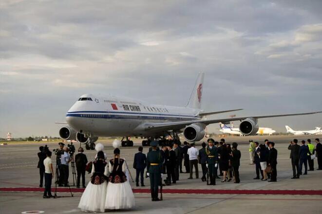 6月12日,國家主席習近平乘專機抵達比什凱克,開始對吉爾吉斯共和國進行國事訪問并出席上海合作組織成員國元首理事會第十九次會議。吉爾吉斯斯坦總統熱恩別科夫在舷梯旁熱情迎接。新華社記者 謝環馳 攝