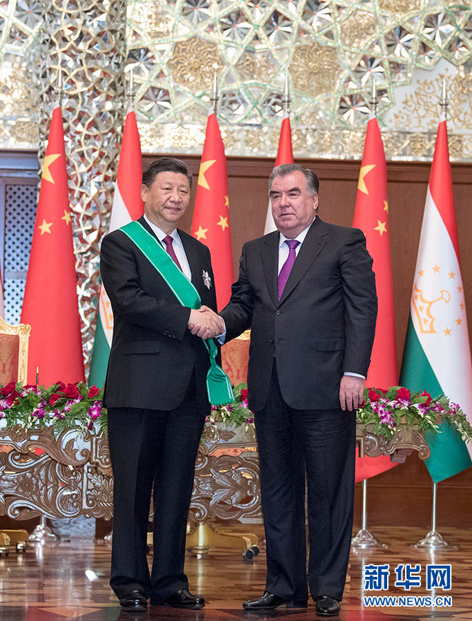 授勛儀式在總統府舉行。塔方司儀宣讀授勛總統令后,拉赫蒙為習近平佩掛塔吉克斯坦國家最高勛章“王冠勛章”。兩國元首親切握手,合影留念。