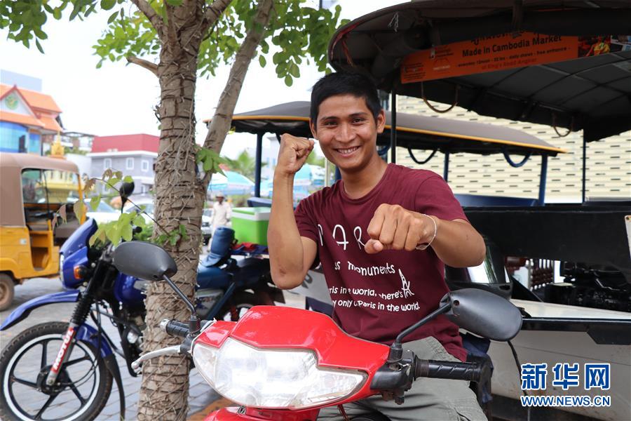 6月11日,在柬埔寨暹粒,孫塞貼農(nóng)騎在嘟嘟車上對鏡頭做出武術(shù)動作。新華社記者 毛鵬飛 攝