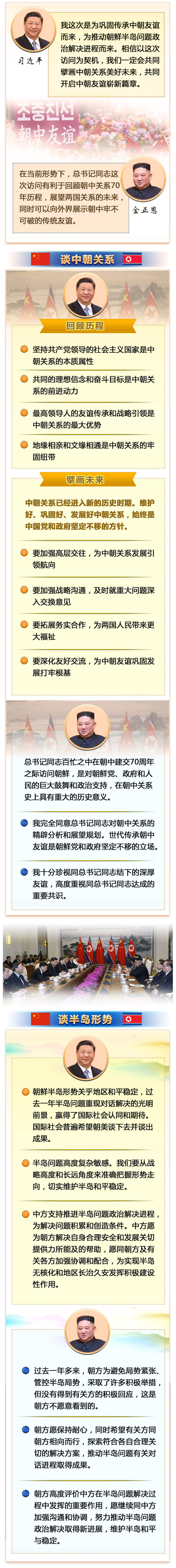 金正恩說,我代表朝鮮黨、政府和人民,熱烈歡迎習近平總書記對朝鮮進行國事訪問。總書記同志百忙之中在朝中建交70周年之際訪問朝鮮,是對朝鮮黨、政府和人民的巨大鼓舞和政治支持,在朝中關(guān)系史上具有重大的歷史意義。今天平壤有25萬多民眾涌上街頭,熱烈歡迎總書記同志。在當前形勢下,總書記同志這次訪問有利于回顧朝中關(guān)系70年歷程,展望兩國關(guān)系的未來,同時可以向外界展示朝中牢不可破的傳統(tǒng)友誼。我完全同意總書記同志對朝中關(guān)系的精辟分析和展望規(guī)劃。世代傳承朝中友誼是朝鮮黨和政府堅定不移的立場。我十分珍視同總書記同志結(jié)下的深厚友誼,高度重視同總書記同志達成的重要共識,愿以總書記同志這次訪朝為契機,推動朝中雙方進一步加強戰(zhàn)略溝通,深化各領(lǐng)域友好交往,把朝中關(guān)系不斷提升至新的高度。