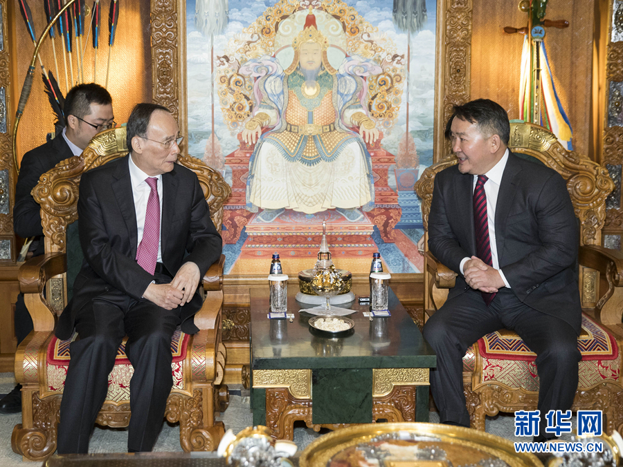 會見前,王岐山出席了呼日勒蘇赫在國家宮舉行的隆重歡迎儀式。會見后,雙方共同見證了建立友城、援建殘疾兒童康復(fù)中心附屬設(shè)施等雙邊合作文件的簽署,并為中方援建的新機場高速公路竣工、那來哈公路開工揭牌。
