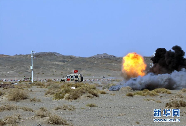 在“國際軍事比賽-2019”“安全環(huán)境”項目單組賽中,中國參賽隊快速通過雷爆區(qū)(8月8日攝)。新華社發(fā)(王軍強(qiáng) 攝)