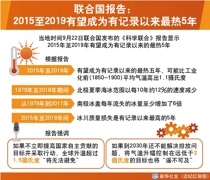 新華社聯(lián)合國9月22日電(記者王建剛)聯(lián)合國22日發(fā)布的一份報(bào)告顯示,2015年至2019年有望成為有記錄以來的最熱5年。