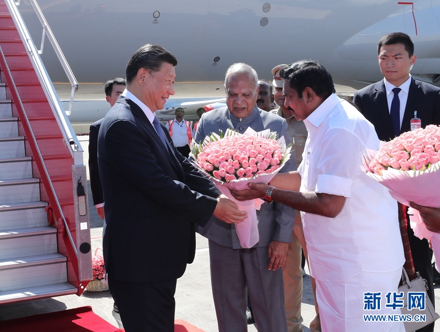 當地時間下午2時10分許,習近平乘坐的專機抵達金奈國際機場。習近平步出艙門,印度泰米爾納德邦邦長普羅希特、首席部長帕拉尼斯瓦米等在舷梯旁迎接,向習近平敬獻鮮花。身著民族服裝的當地民眾載歌載舞,有的表演富有濃郁民族特色的婆羅多舞,有的踩高蹺、劃旱船,盛情歡迎中國貴賓到來。