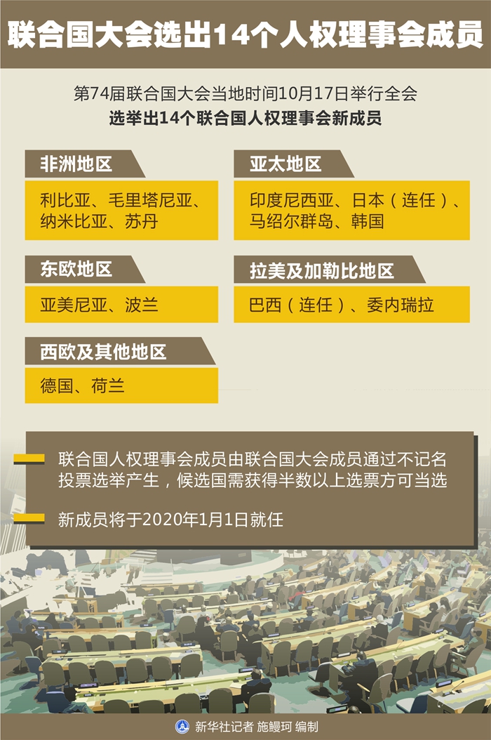 新華社聯(lián)合國10月17日電(記者尚緒謙)第74屆聯(lián)合國大會17日舉行全會,選舉出14個聯(lián)合國人權(quán)理事會新成員,以接替將于今年年底結(jié)束任期的成員。新成員將于2020年1月1日就任。