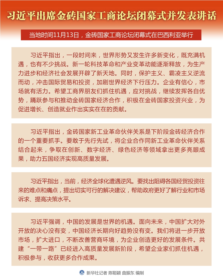 當?shù)貢r間11月13日,金磚國家工商論壇閉幕式在巴西利亞舉行。國家主席習近平出席并發(fā)表講話。 新華社記者 謝環(huán)馳 攝