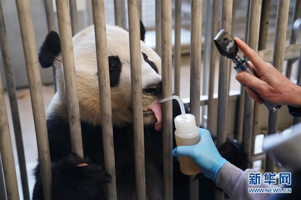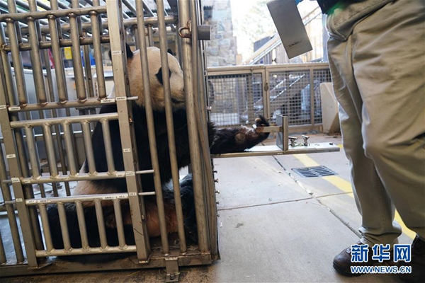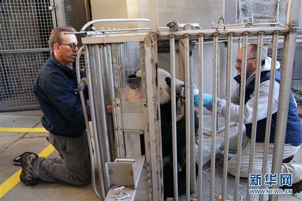 11月13日,在美國華盛頓的美國國家動(dòng)物園,工作人員在為大熊貓“貝貝”體檢。新華社記者 劉杰 攝