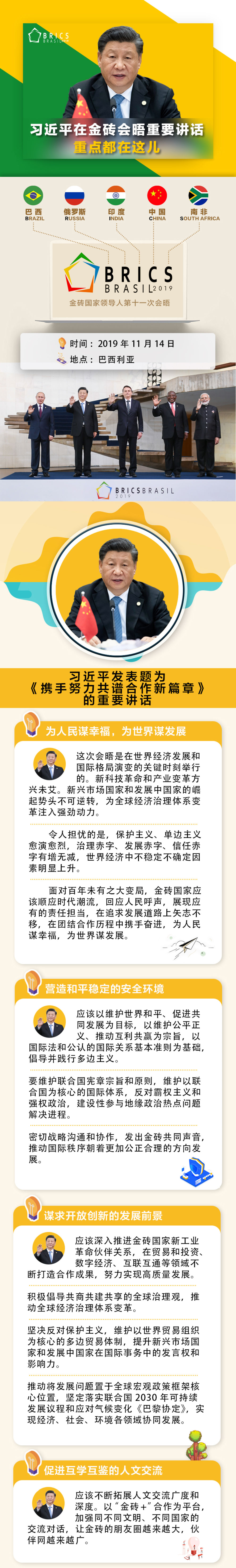 當?shù)貢r間11月14日,金磚國家領(lǐng)導人第十一次會晤在巴西首都巴西利亞舉行。巴西總統(tǒng)博索納羅主持會晤。中國國家主席習近平、俄羅斯總統(tǒng)普京、印度總理莫迪、南非總統(tǒng)拉馬福薩出席。習近平發(fā)表題為《攜手努力共譜合作新篇章》的重要講話。當天,金磚國家領(lǐng)導人還舉行閉門會議,習近平在會上發(fā)表重要講話。